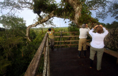 Efter frukost tar ni båten till utsiktstornet ”canopy tower” som ligger ca 30 min med kanot från lodgen och 15 min promenad genom snårig och tät djungel. Tornet är ca 25 m högt och utsikten är fantastisk över trädtopparna. Här finns flera arter av macaws, dom så kallade papegojorna i sina färgglada färger, tukaner samt sengångare uppe bland trädtopparna. Tillbaka till lodgen för lunch. Möjlighet att ta det lugnt efter lunchen och slappa i hängmattor eller läsa en bok. Senare på eftermiddagen beger ni er ut på någon av trekking stigarna som utgår från lodgen. Regnskogens växlighet med orchidéer och stora träd uppfyller förväntningarna. I lagom tid tillbaka till lodgen för middag för att senare i mörkret med kanot söka efter kajmaner.